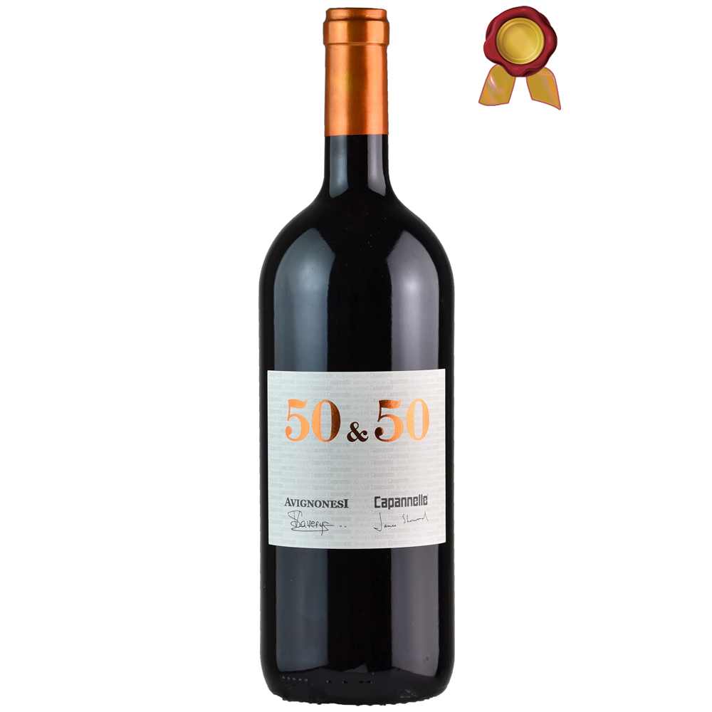 Il 50 & 50 é un vino che nasce da una storica amicizia, tra i propietari di Avignonesi a Montepulciano e Capannelle nel Chianti, durante una cena di tantissimi anni fa’, si confrontarono i vini di entrambe le cantine e nacque l’affascinante idea di fare un vino prodotto con: 50% da Uve Merlot di Avignonesi, 50% da Uve Sangiovesi di Capannelle. L’uva raccolta per il 50&50 è frutto di un’accurata selezione dai migliori vigneti di merlot e di sangiovese. Viene Fermentato a temperatura controllata con macerazione sulle bucce per 20-25 giorni. La Maturazione avviene per 24 mesi in Barriques francesi.